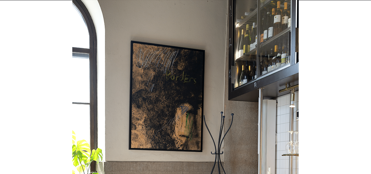 Just detta verk är en del av en svit där gränsen Green Line (en markeringslinje som gjordes mellan Israel och dess arabiska grannar efter kriget 1948) målades upp för att sedan kollektivt suddas ut av besökare av utställningen.